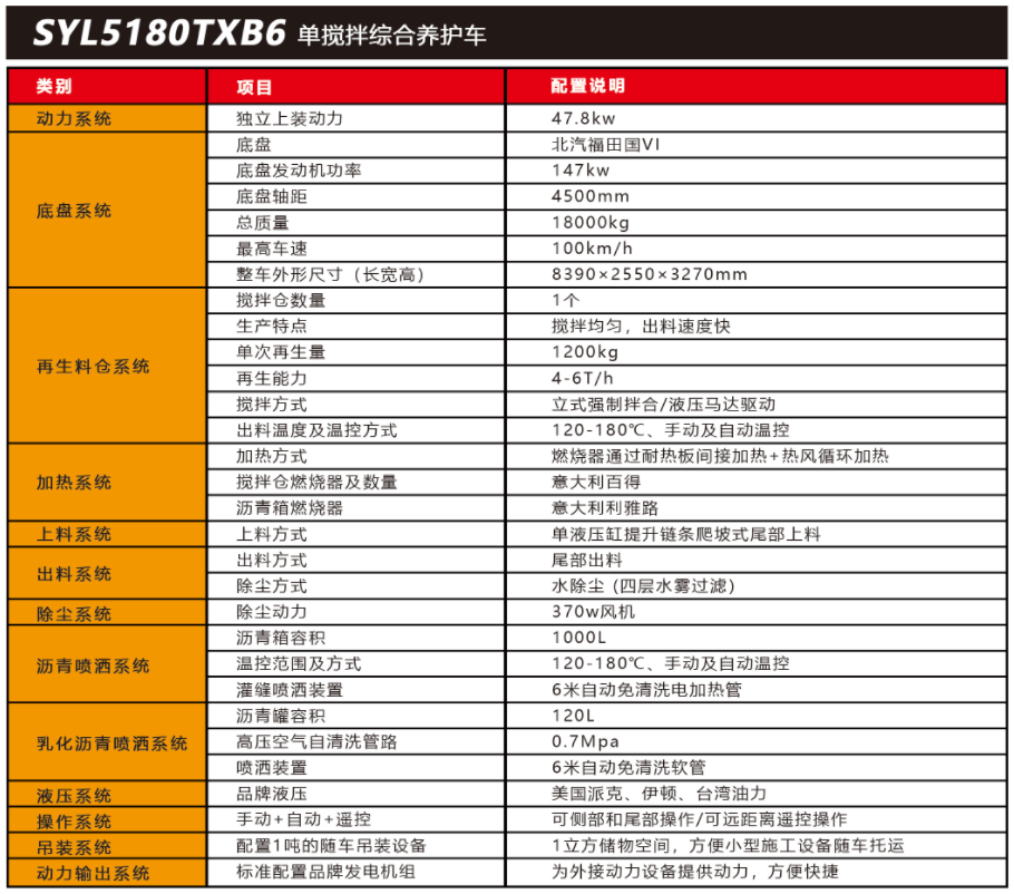 SYL5180TXB6 單攪拌綜合養(yǎng)護車是一款集現(xiàn)場生產新瀝青混合料、瀝青路面冷料、 舊料、銑刨料 100%現(xiàn)場加熱再生利用 ,熱瀝青灑布、裂紋跟蹤灌縫、乳化瀝青噴灑、為 其他裝置提供電力和液壓動力等多種功能于一體的瀝青路面熱再生綜合養(yǎng)護車??蓪崿F(xiàn)多 場合、多路面的各種類養(yǎng)護作業(yè) ,養(yǎng)護修補費用低 ,作業(yè)快捷 ,高效率、節(jié)能環(huán)保性能突 出等特點。適用于遠郊較寬闊區(qū)域中小施工量和高速公路的修補施工。
