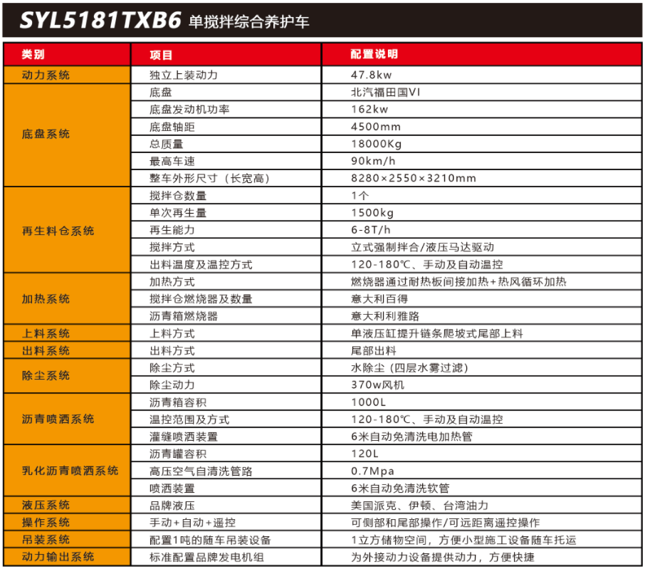SYL5181TXB6 單攪拌綜合養(yǎng)護(hù)車是一款集現(xiàn)場生產(chǎn)新瀝青混合料、瀝青路面冷料、 舊料、銑刨料100%現(xiàn)場加熱再生利用 ,熱瀝青灑布、裂紋跟蹤灌縫、乳化瀝青噴灑、為其他裝置提供電力和液壓動力等多種功能于一體的瀝青路面熱再生綜合養(yǎng)護(hù)車??蓪?shí)現(xiàn)多場合、多路面的各種類養(yǎng)護(hù)作業(yè) ,養(yǎng)護(hù)修補(bǔ)費(fèi)用低 ,作業(yè)快捷 ,高效率、節(jié)能環(huán)保性能突出等特點(diǎn)。適用于遠(yuǎn)郊較寬闊區(qū)域中大施工量和高速公路的修補(bǔ)施工。