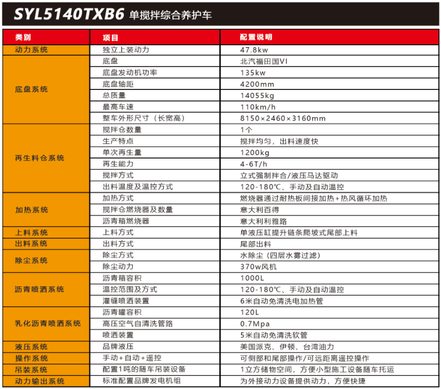SYL5140TXB6 單攪拌綜合養(yǎng)護(hù)車(chē)是一款集現(xiàn)場(chǎng)生產(chǎn)新瀝青混合料、瀝青路面冷料、 舊料、銑刨料100%現(xiàn)場(chǎng)加熱再生利用 ,熱瀝青灑布、裂紋跟蹤灌縫、乳化瀝青噴灑、為其他裝置提供電力和液壓動(dòng)力等多種功能于一體的瀝青路面熱再生綜合養(yǎng)護(hù)車(chē)??蓪?shí)現(xiàn)多場(chǎng)合、多路面的各種類(lèi)養(yǎng)護(hù)作業(yè) ,養(yǎng)護(hù)修補(bǔ)費(fèi)用低 ,作業(yè)快捷 ,高效率、節(jié)能環(huán)保性能突出等特點(diǎn)。適用于市政、國(guó)省道路、鄉(xiāng)村公路、廠區(qū)、園區(qū)等瀝青路面中小養(yǎng)護(hù)修補(bǔ)施工。